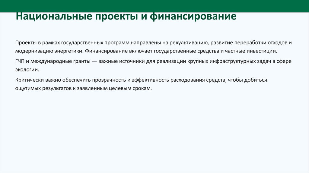 Национальные проекты и финансированиеПроекты в рамках государственных программ направлены на рекультивацию, развитие переработки отходов и