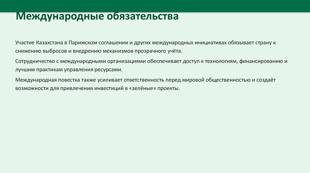 Международные обязательстваУчастие Казахстана в Парижском соглашении и других международных инициативах обязывает страну к