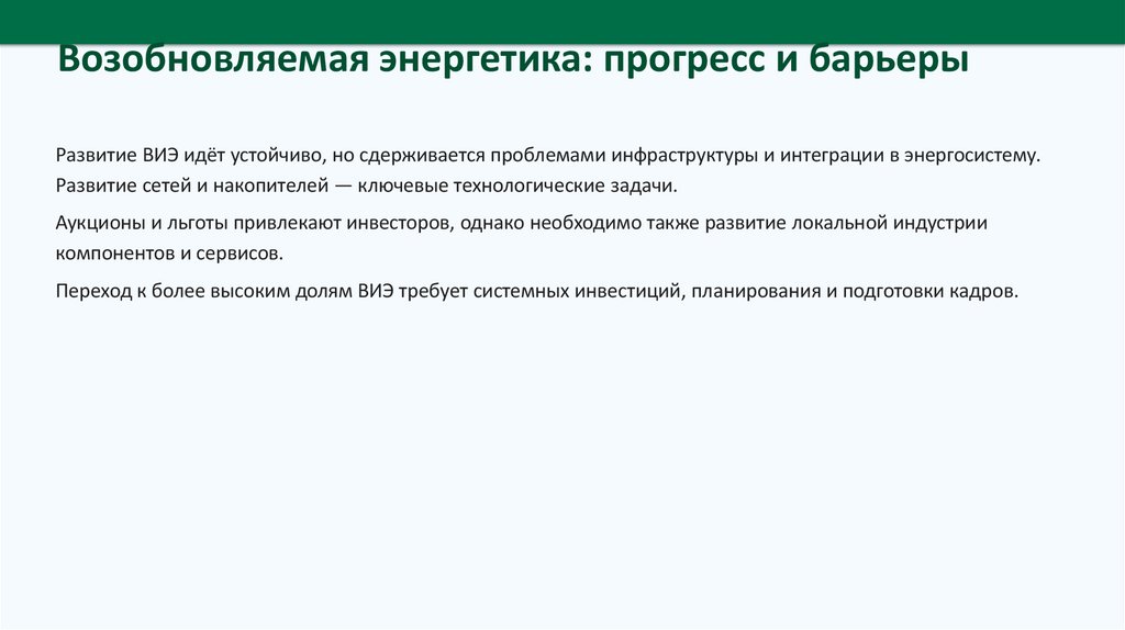 Возобновляемая энергетика: прогресс и барьерыРазвитие ВИЭ идёт устойчиво, но сдерживается проблемами инфраструктуры и интеграции в энергосистему.