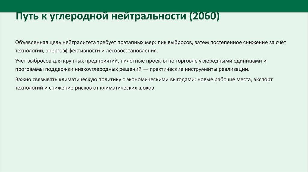Путь к углеродной нейтральности (2060)Объявленная цель нейтралитета требует поэтапных мер: пик выбросов, затем постепенное снижение за счёт