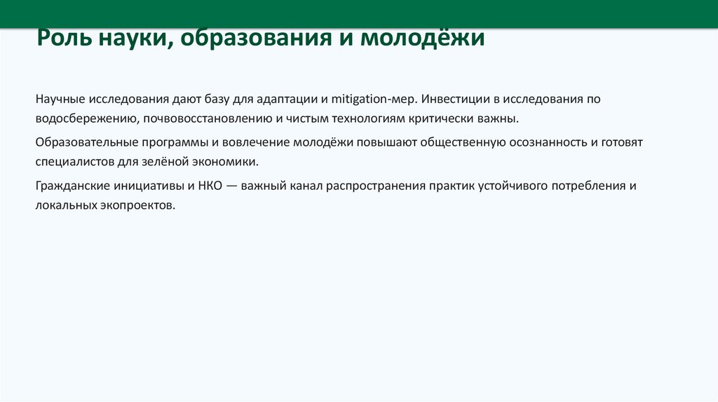 Роль науки, образования и молодёжиНаучные исследования дают базу для адаптации и mitigation-мер. Инвестиции в исследования по