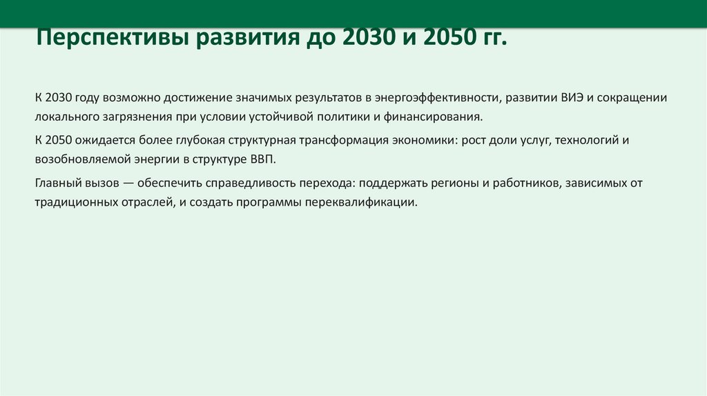 Перспективы развития до 2030 и 2050 гг.К 2030 году возможно достижение значимых результатов в энергоэффективности, развитии ВИЭ и сокращении