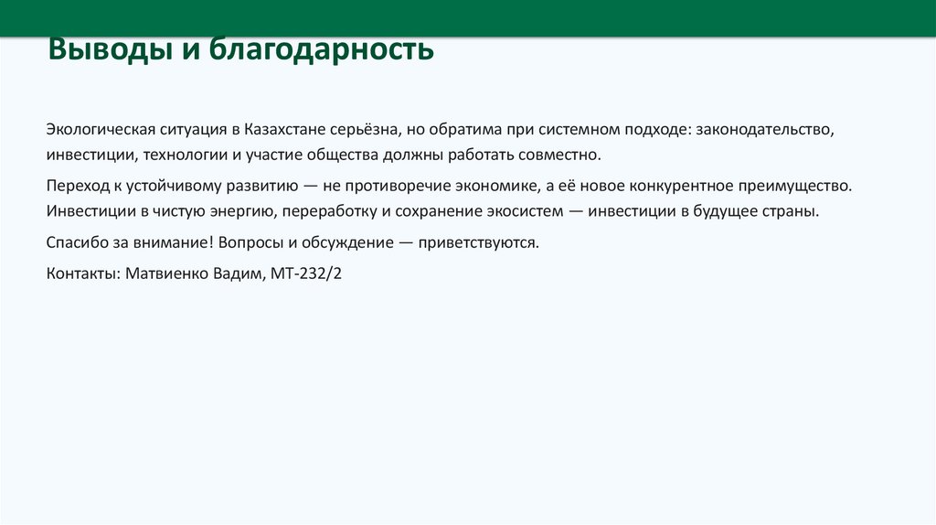 Выводы и благодарностьЭкологическая ситуация в Казахстане серьёзна, но обратима при системном подходе: законодательство,
