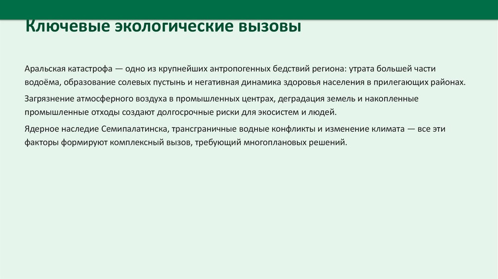 Ключевые экологические вызовыАральская катастрофа — одно из крупнейших антропогенных бедствий региона: утрата большей части