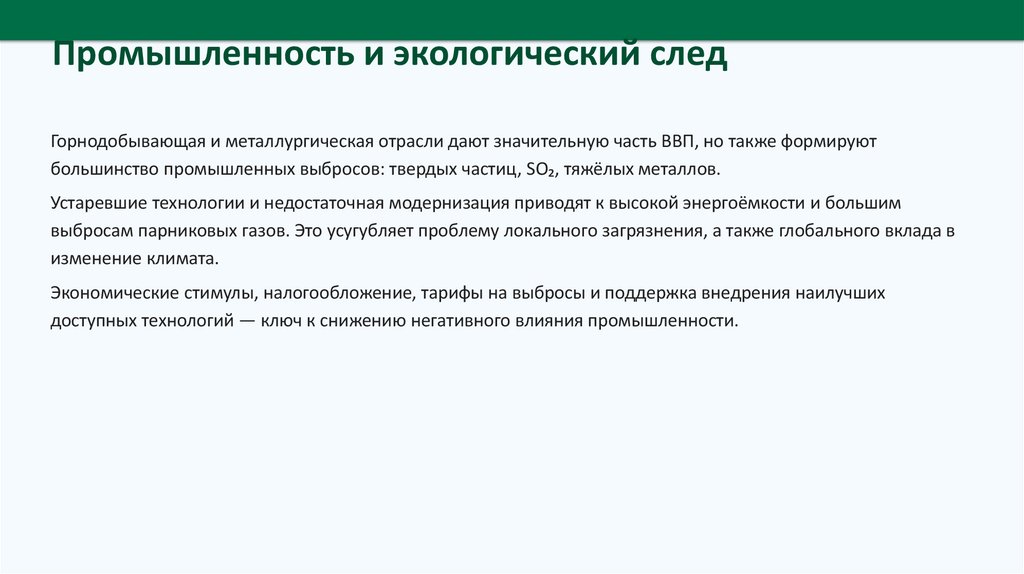 Промышленность и экологический следГорнодобывающая и металлургическая отрасли дают значительную часть ВВП, но также формируют