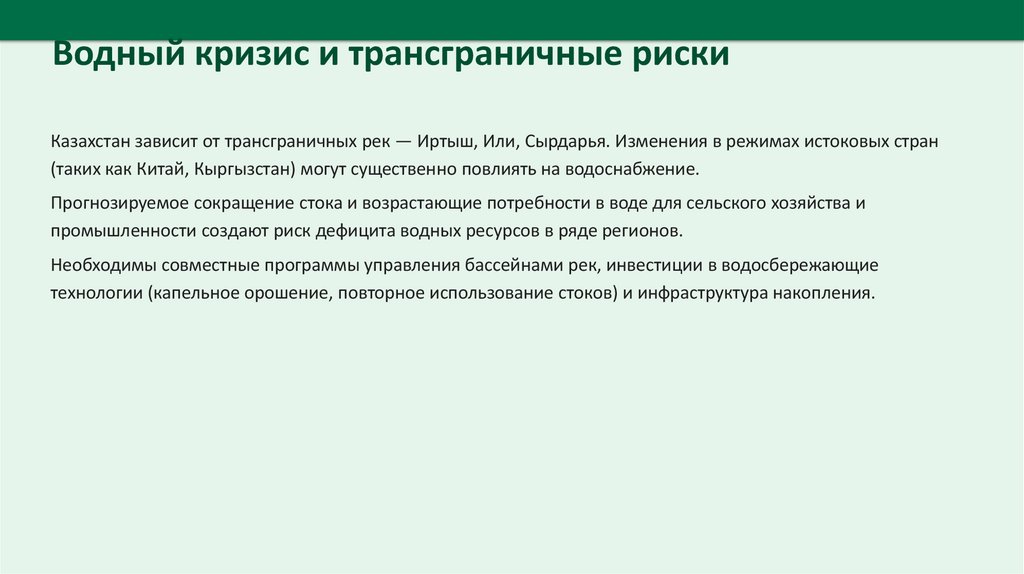 Водный кризис и трансграничные рискиКазахстан зависит от трансграничных рек — Иртыш, Или, Сырдарья. Изменения в режимах истоковых стран