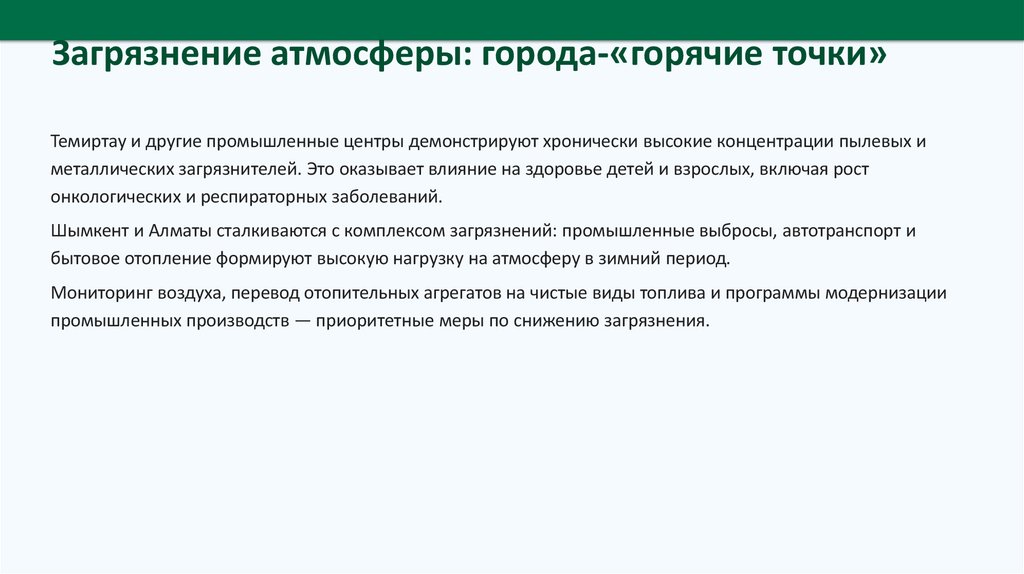 Загрязнение атмосферы: города-«горячие точки»Темиртау и другие промышленные центры демонстрируют хронически высокие концентрации пылевых и