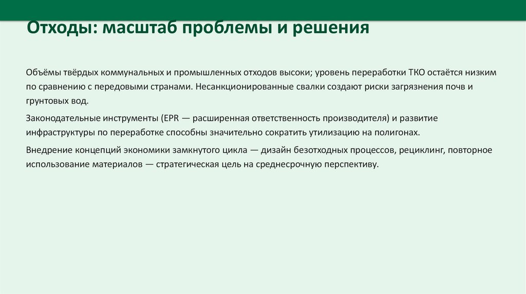 Отходы: масштаб проблемы и решенияОбъёмы твёрдых коммунальных и промышленных отходов высоки; уровень переработки ТКО остаётся низким