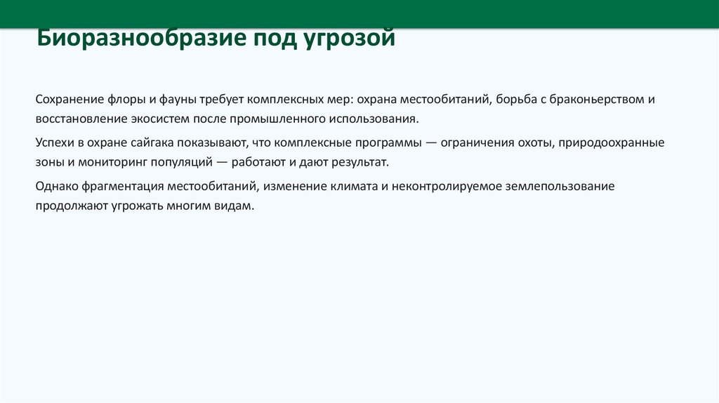 Биоразнообразие под угрозойСохранение флоры и фауны требует комплексных мер: охрана местообитаний, борьба с браконьерством и