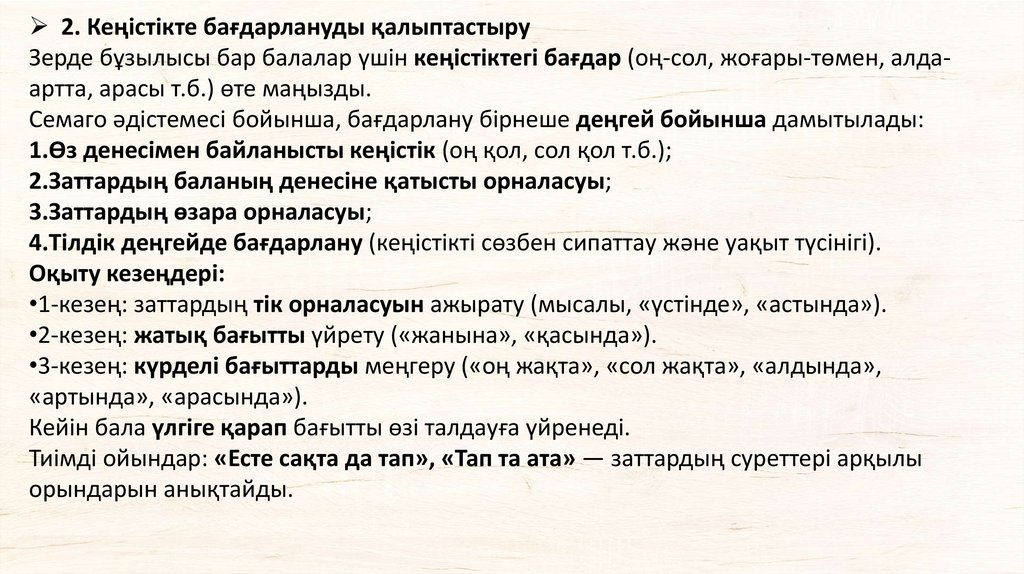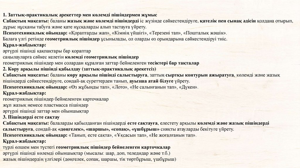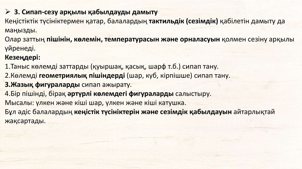 •Сенсорика: заттың пішіні мен бөліктерін ажырату, тұтас және бөлшек түсінігі.