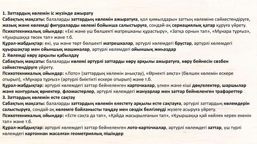 •Сенсорика: заттардың пішіні мен көлемін көзбен салыстыру, қолмен сезіну.