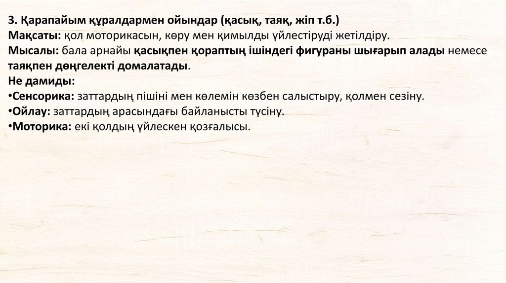 3. Қарапайым құралдармен ойындар (қасық, таяқ, жіп т.б.)Мақсаты: қол моторикасын, көру мен қимылды үйлестіруді жетілдіру.