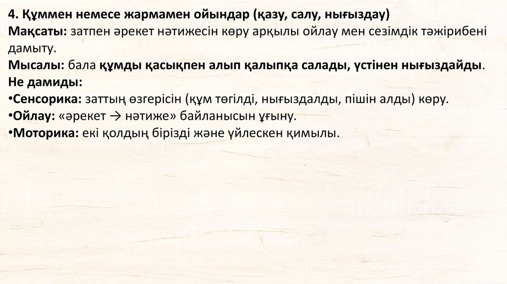4. Құммен немесе жармамен ойындар (қазу, салу, нығыздау)Мақсаты: затпен әрекет нәтижесін көру арқылы ойлау мен сезімдік тәжірибені