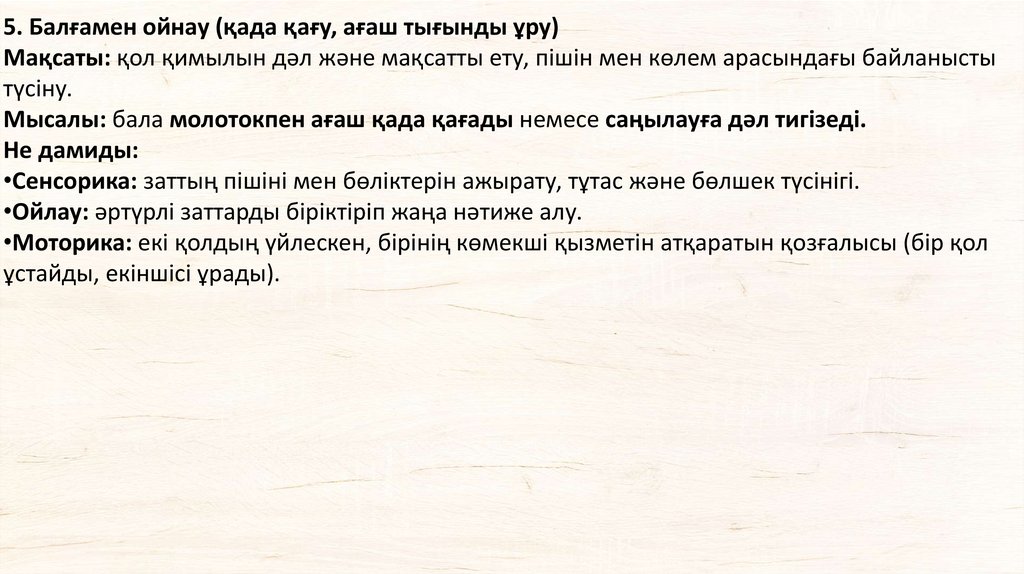 5. Балғамен ойнау (қада қағу, ағаш тығынды ұру)Мақсаты: қол қимылын дәл және мақсатты ету, пішін мен көлем арасындағы байланысты