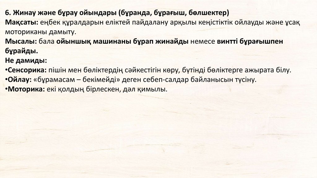 6. Жинау және бұрау ойындары (бұранда, бұрағыш, бөлшектер)Мақсаты: еңбек құралдарын еліктей пайдалану арқылы кеңістіктік ойлауды және ұсақ