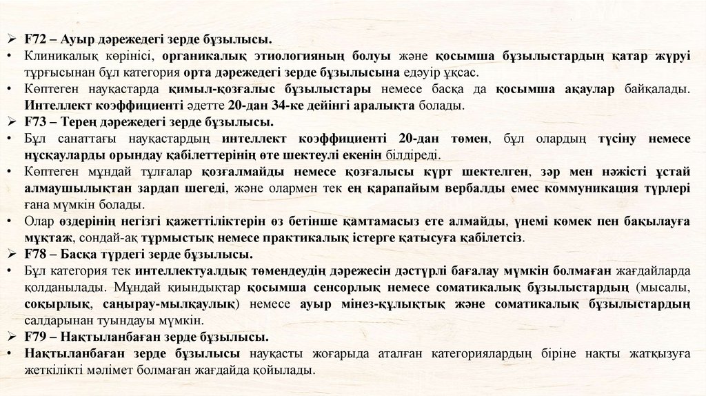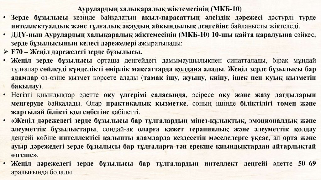 Аурулардың халықаралық жіктемесінің (МКБ-10)• Зерде бұзылысы кезінде байқалатын ақыл-парасаттың әлсіздік дәрежесі дәстүрлі түрде