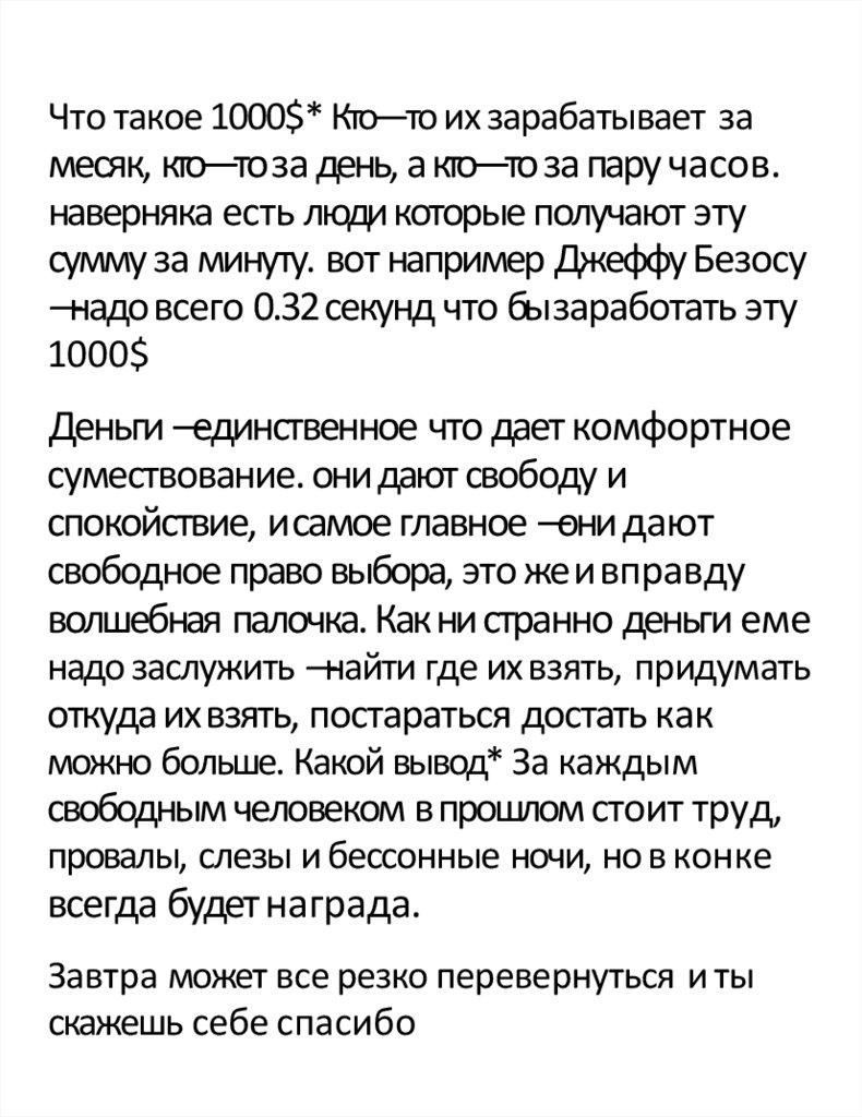 Что такое 1000$* Кто—то их зарабатывает замесяк, кто—тоза день, а кто—тоза пару часов.