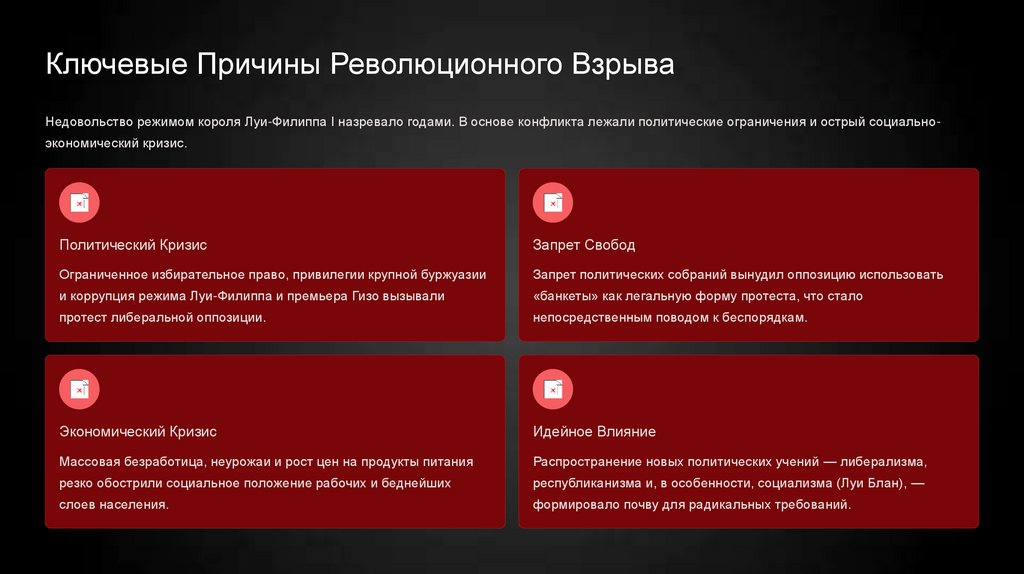 Ключевые Причины Революционного ВзрываНедовольство режимом короля Луи-Филиппа I назревало годами. В основе конфликта лежали политические ограничения и острый социальноэкономический кризис.