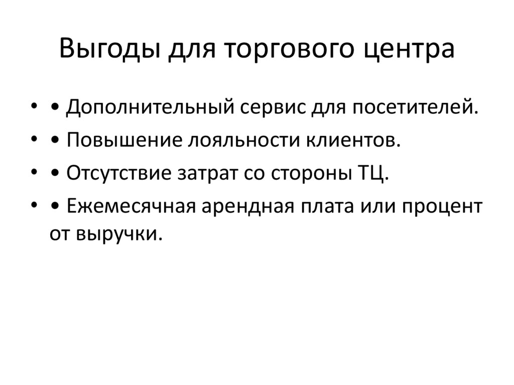 Выгоды для торгового центра• • Дополнительный сервис для посетителей.
