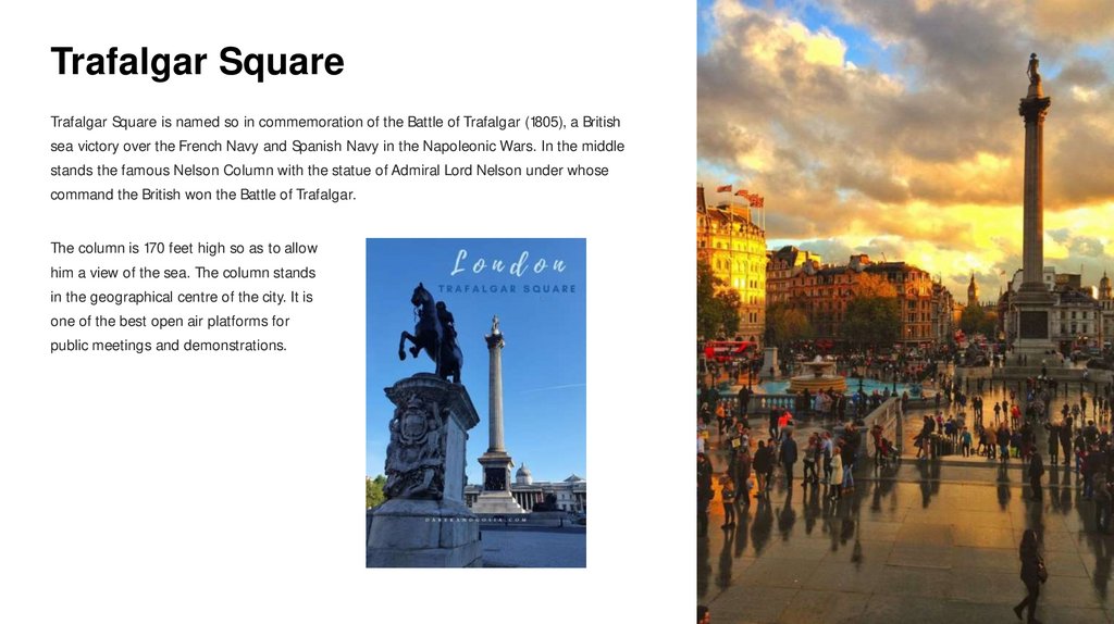 Trafalgar SquareTrafalgar Square is named so in commemoration of the Battle of Trafalgar (1805), a British