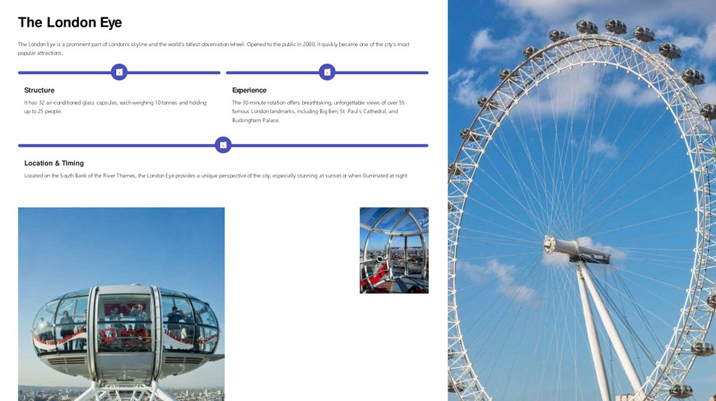 The London EyeThe London Eye is a prominent part of London’s skyline and the world’s tallest observation wheel. Opened to the public in 2000, it quickly became one of the city’s most