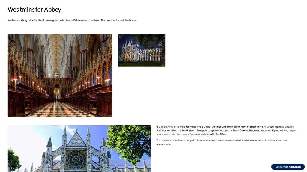 Wes tmins ter AbbeyWestminster Abbey is the traditional crowning and burial place of British monarchs and one of London’s most historic landmarks.