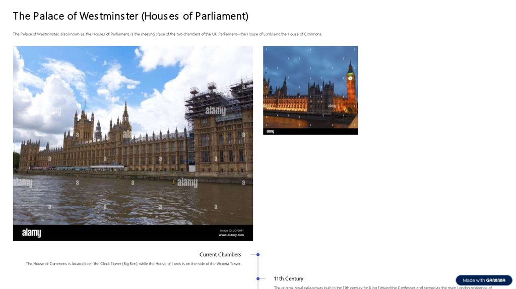 The Palace of Wes tmins ter (Hous es of Parliament)The Palace of Westminster, also known as the Houses of Parliament, is the meeting place of the two chambers of the UK Parliament—the House of Lords and the House of Commons.