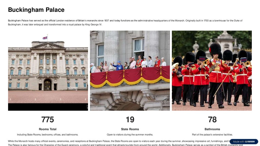 The Palace is also famous for the Changing of the Guard ceremony, a colorful and traditional event that attracts tourists from around the world. Additionally, Buckingham Palace serves as a symbol of the British monarchy and
