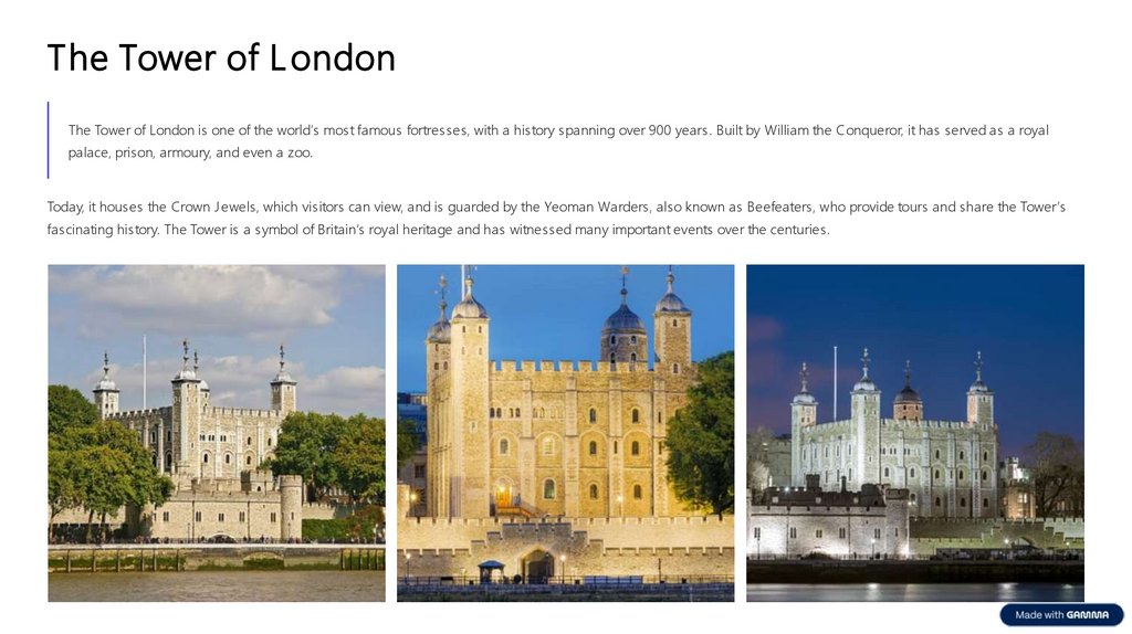 fascinating history. The Tower is a symbol of Britain’s royal heritage and has witnessed many important events over the centuries.
