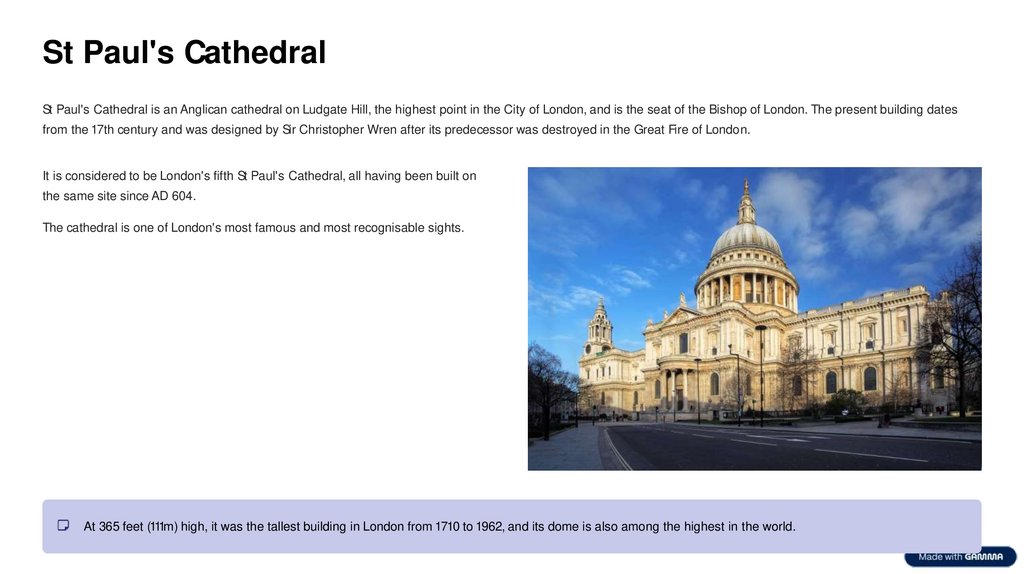 St Paul's CathedralSt Paul's Cathedral is an Anglican cathedral on Ludgate Hill, the highest point in the City of London, and is the seat of the Bishop of London. The present building dates