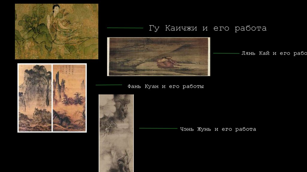 • 1.Гу Каичжи (344-406) — выдающийся художникраннего периода, известен за портреты и