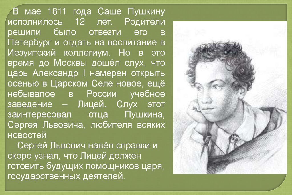 В мае 1811 года Саше Пушкинуисполнилось 12 лет. Родители