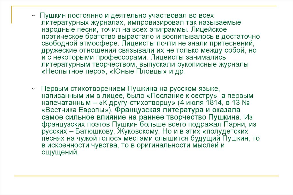 ~ Домашнее воспитание Пушкина А.С. сводилось кблестящему овладению французским языком. Вкус