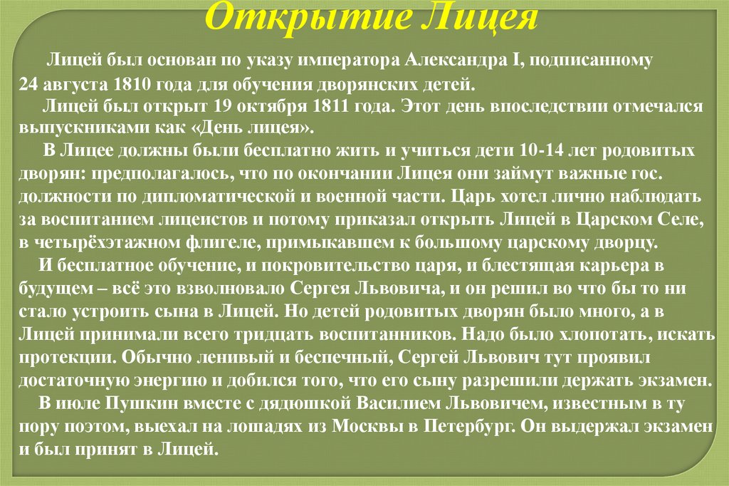 Открытие ЛицеяЛицей был основан по указу императора Александра I, подписанному