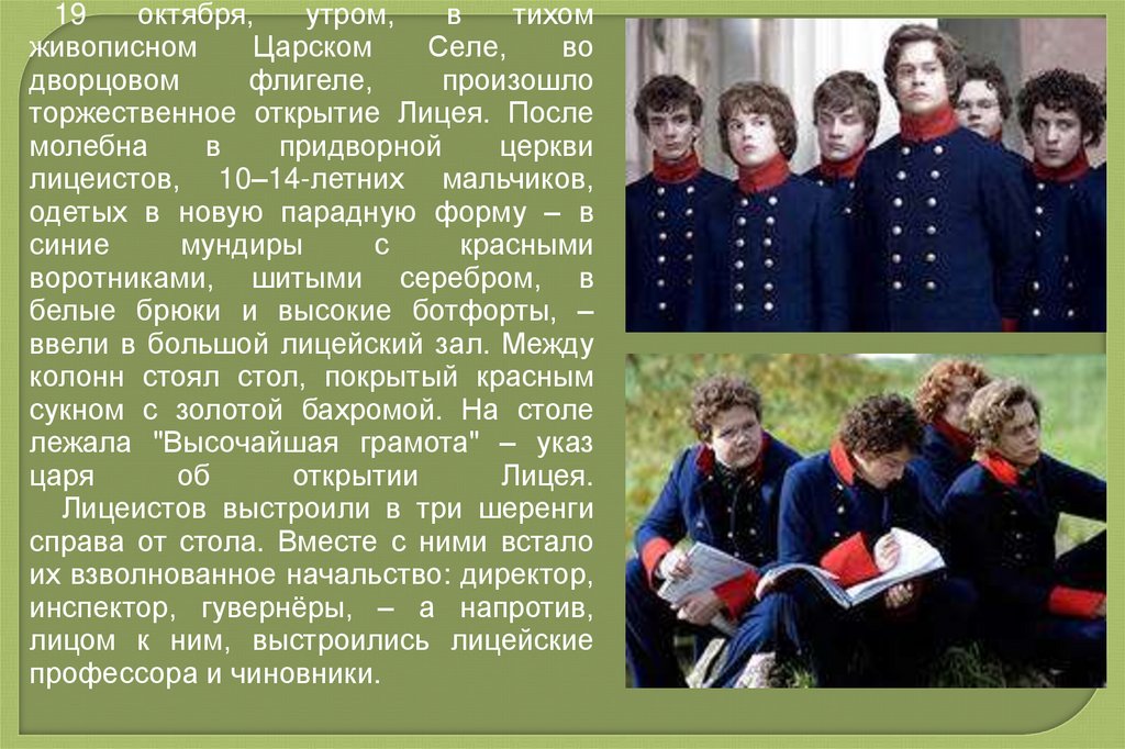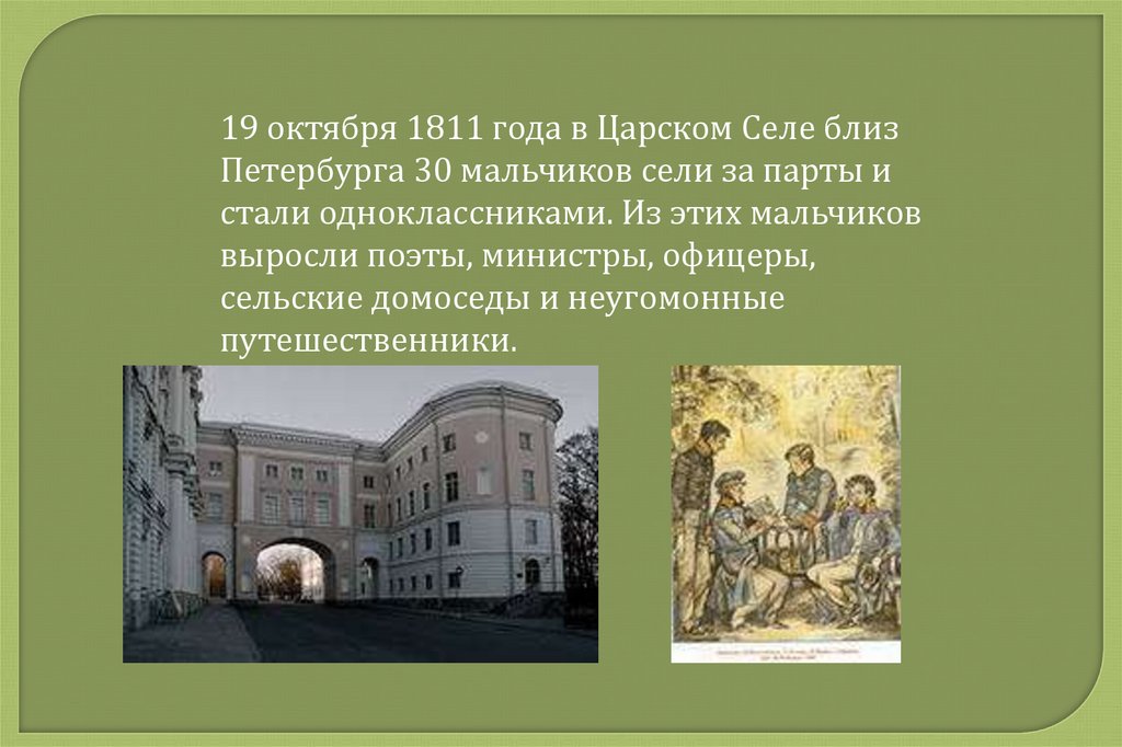 19 октября 1811 года в Царском Селе близПетербурга 30 мальчиков сели за парты и