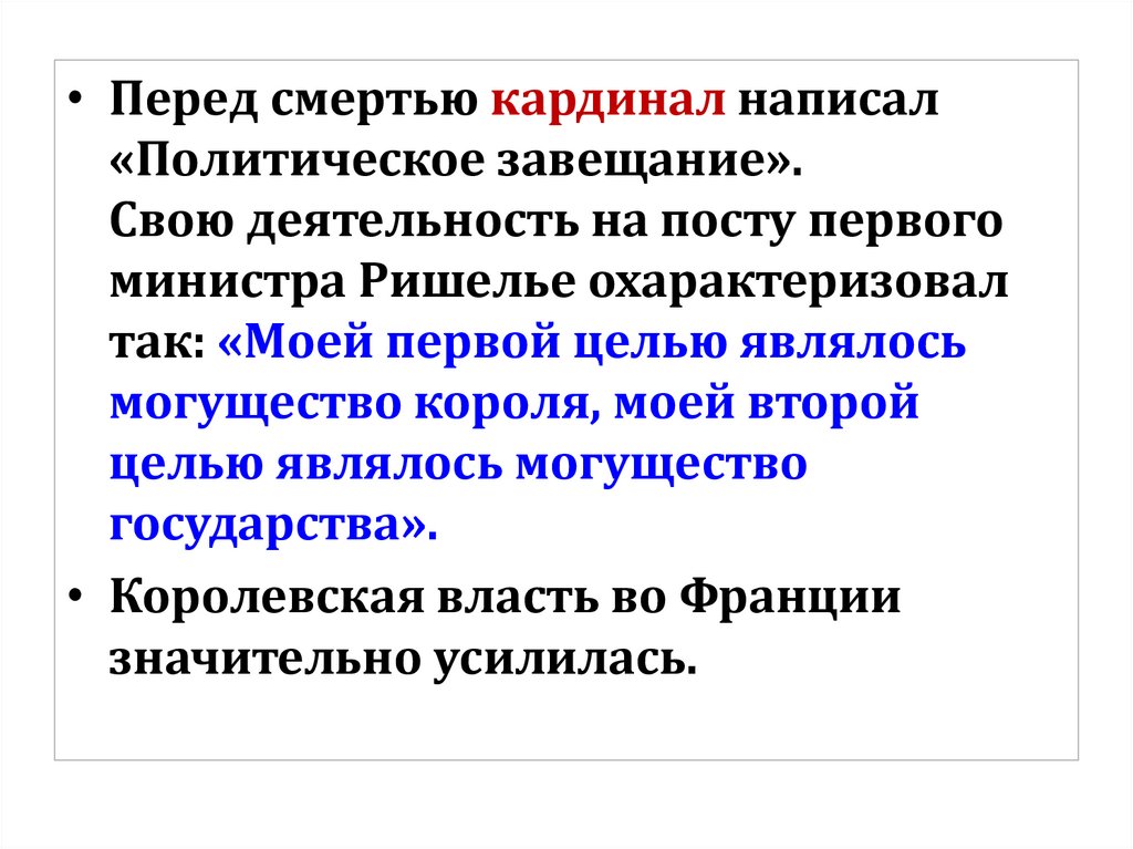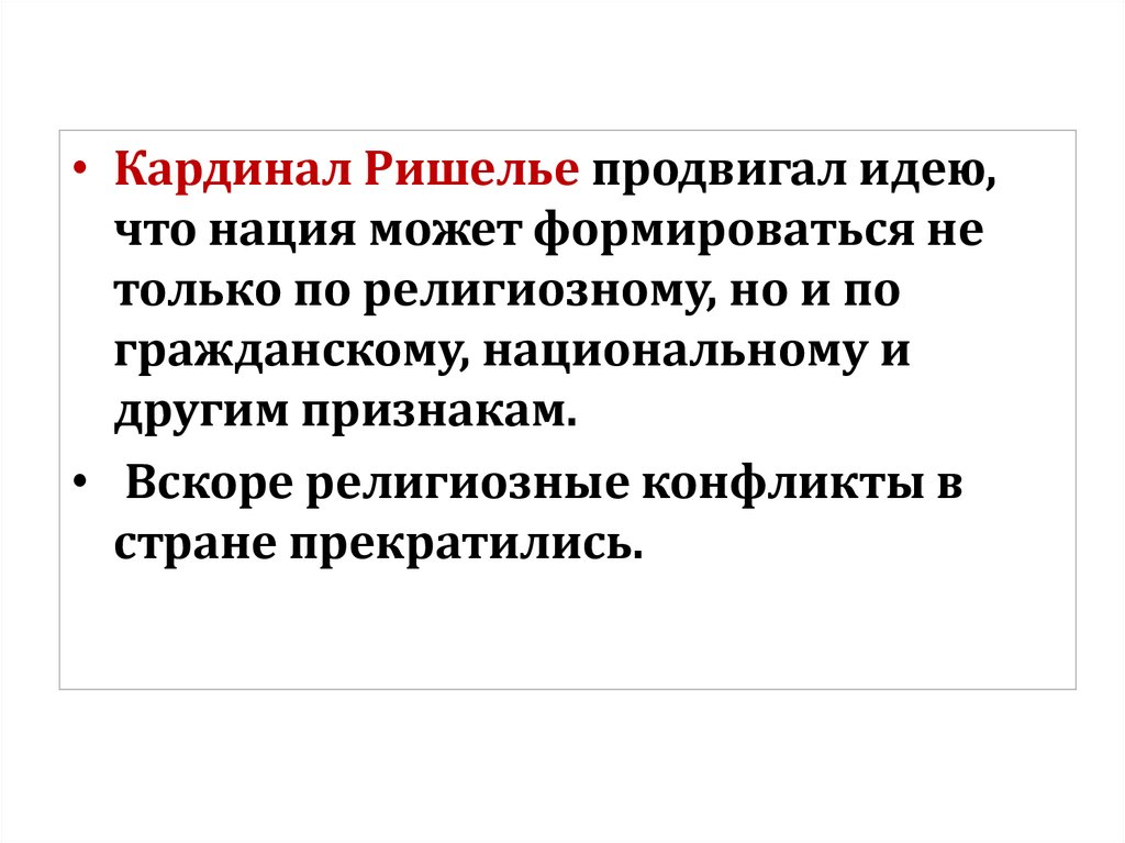 • Кардинал Ришелье продвигал идею,что нация может формироваться не