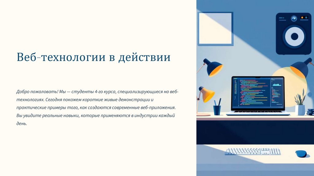 Веб-технологии в действииДобро пожаловать! Мы — студенты 4-го курса, специализирующиеся на вебтехнологиях. Сегодня покажем короткие живые демонстрации и