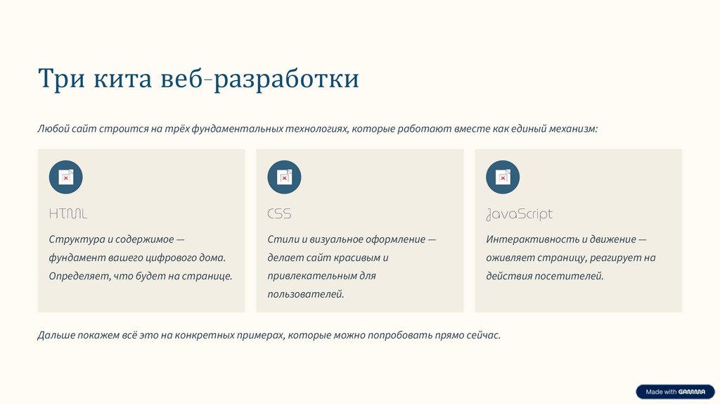 Три кита веб-разработкиЛюбой сайт строится на трёх фундаментальных технологиях, которые работают вместе как единый механизм: