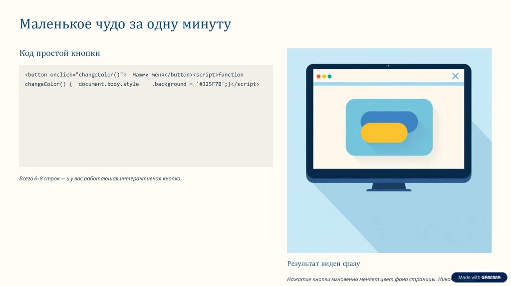 Всего 6–8 строк — и у вас работающая интерактивная кнопка.