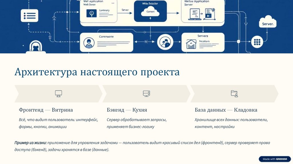 Пример из жизни: приложение для управления задачами — пользователь видит красивый список дел (фронтенд), сервер проверяет права