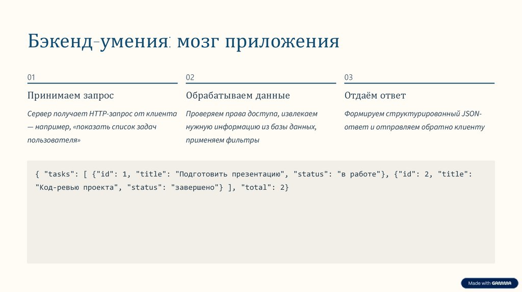 { "tasks": [ {"id": 1, "title": "Подготовить презентацию", "status": "в работе"}, {"id": 2, "title":