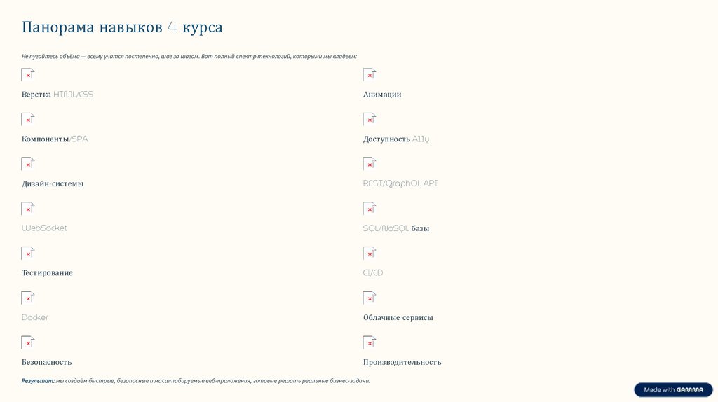 Панорама навыков 4 курсаНе пугайтесь объёма — всему учатся постепенно, шаг за шагом. Вот полный спектр технологий, которыми мы владеем: