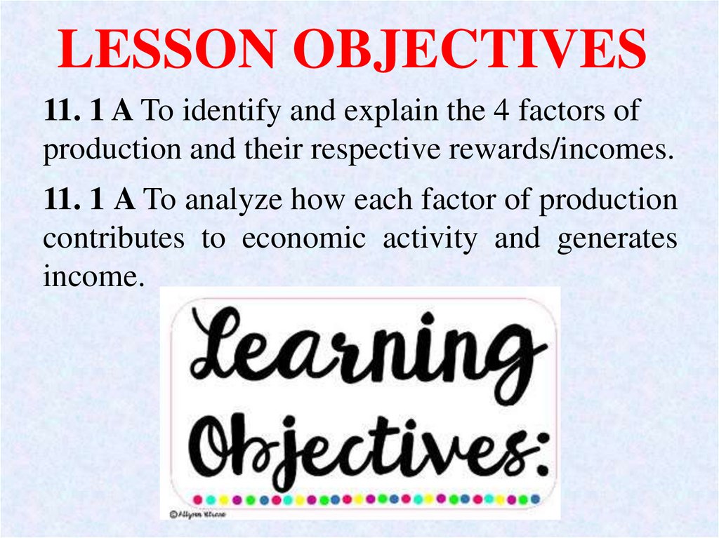 LESSON OBJECTIVES11. 1 A To identify and explain the 4 factors of