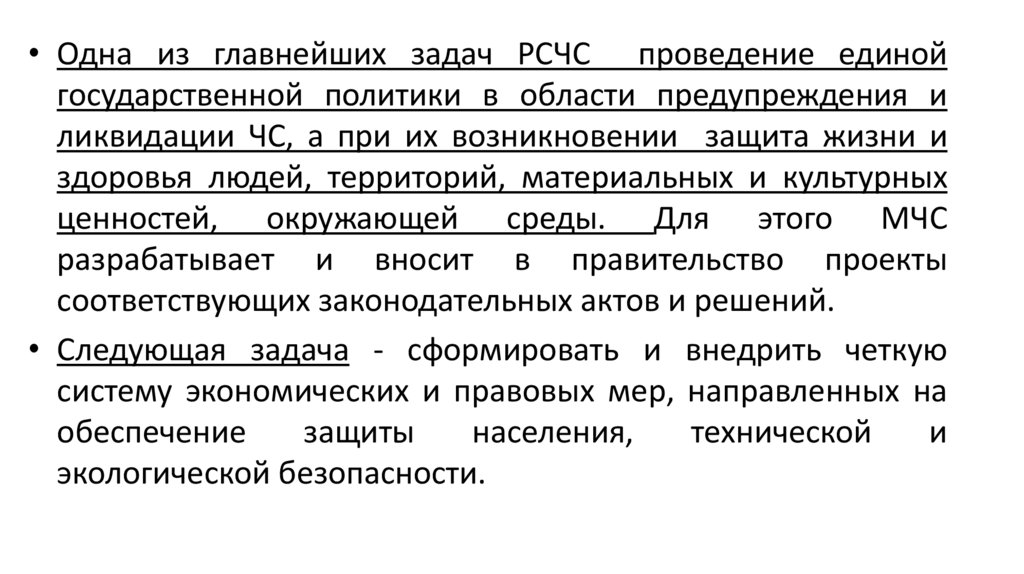 • Одна из главнейших задач РСЧС проведение единойгосударственной политики в области предупреждения и