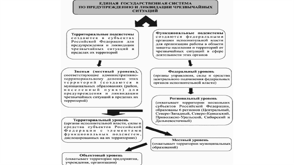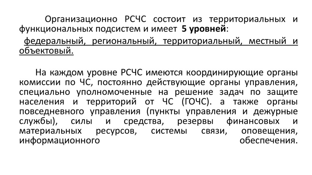 Организационно РСЧС состоит из территориальных ифункциональных подсистем и имеет 5 уровней: