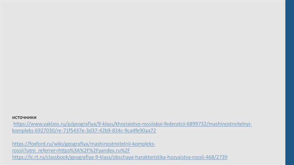 источникиhttps://www.yaklass.ru/p/geografiya/9-klass/khoziaistvo-rossiiskoi-federatcii-6899732/mashinostroitelnyikompleks-6927030/re-71f5437e-3d37-42b9-834c-9ca4fe90aa72