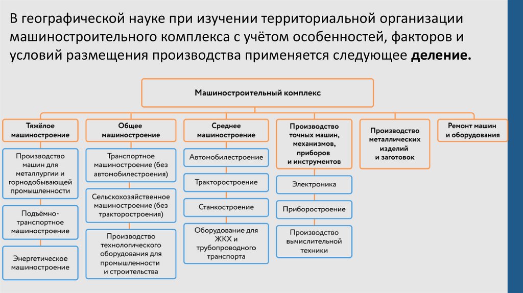 В географической науке при изучении территориальной организациимашиностроительного комплекса с учётом особенностей, факторов и