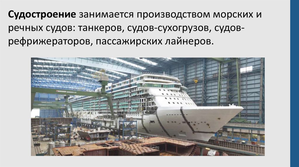 Судостроение занимается производством морских иречных судов: танкеров, судов-сухогрузов, судоврефрижераторов, пассажирских лайнеров.