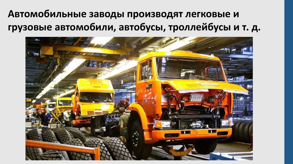 Автомобильные заводы производят легковые игрузовые автомобили, автобусы, троллейбусы и т. д.