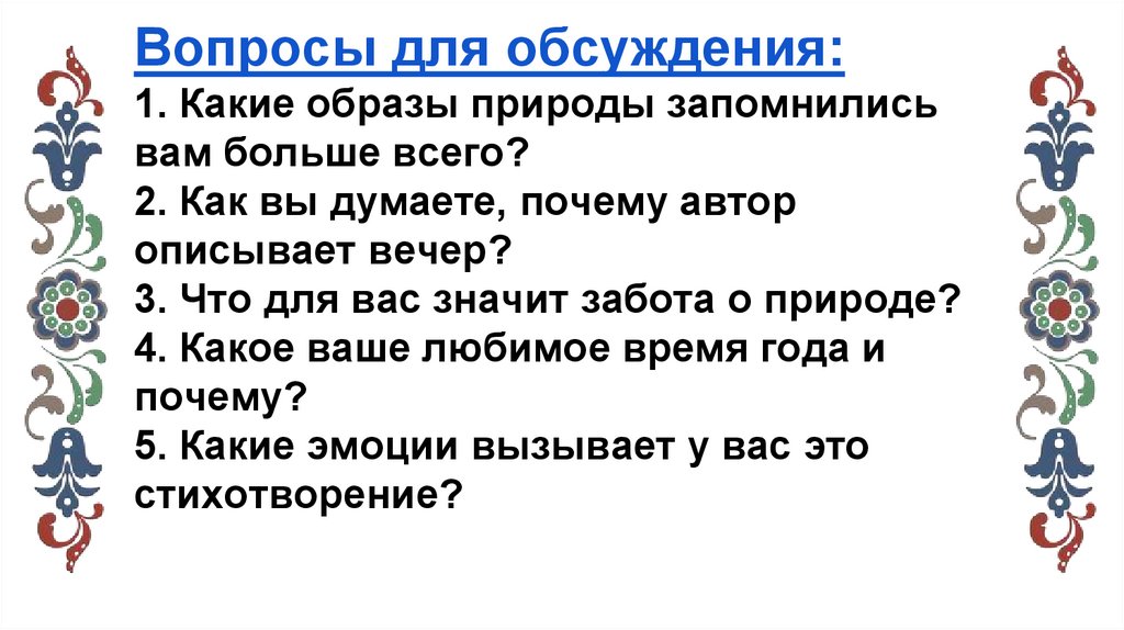 Вопросы для обсуждения:1. Какие образы природы запомнились